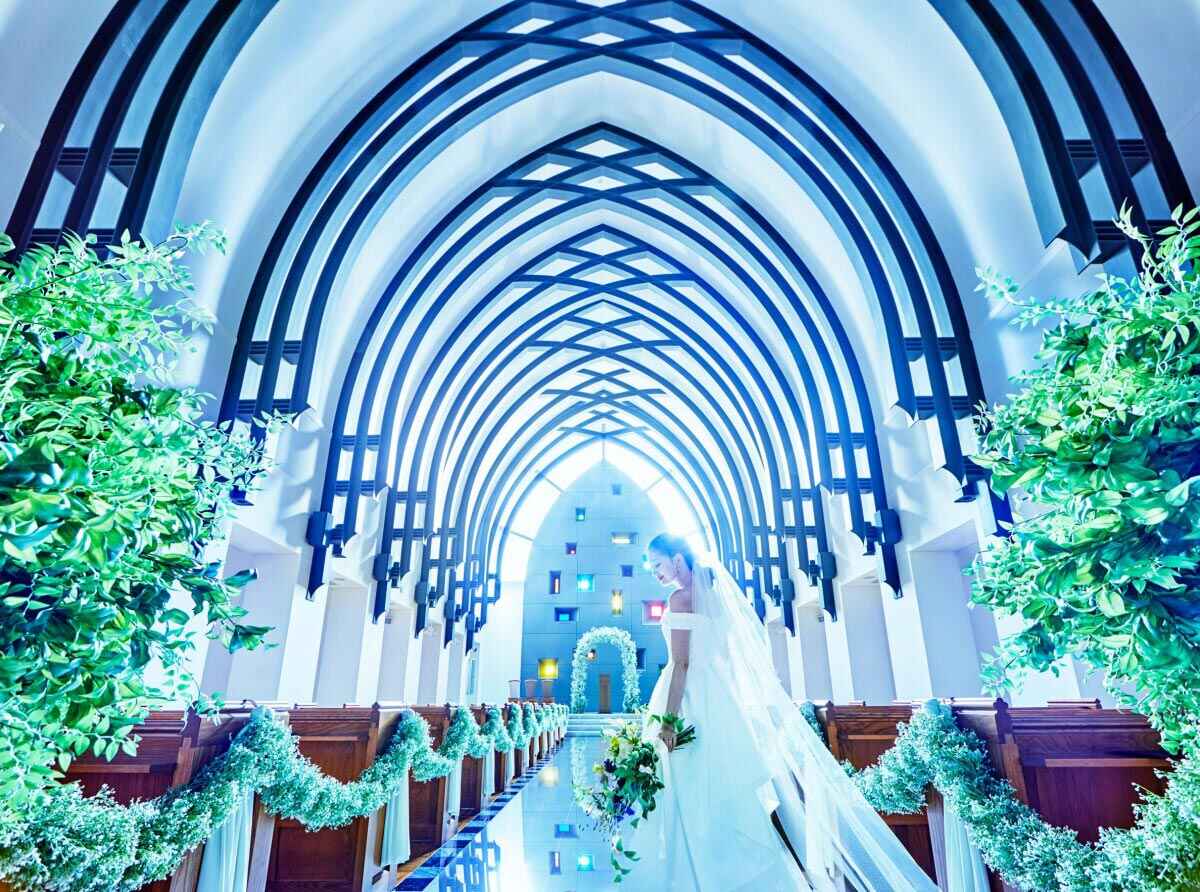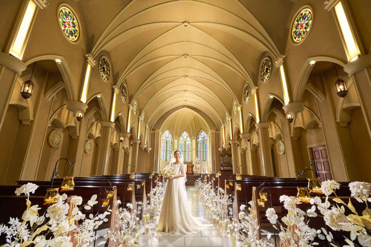 優美なアーチを描く天井と14ⅿもの長さを誇るバージンロード