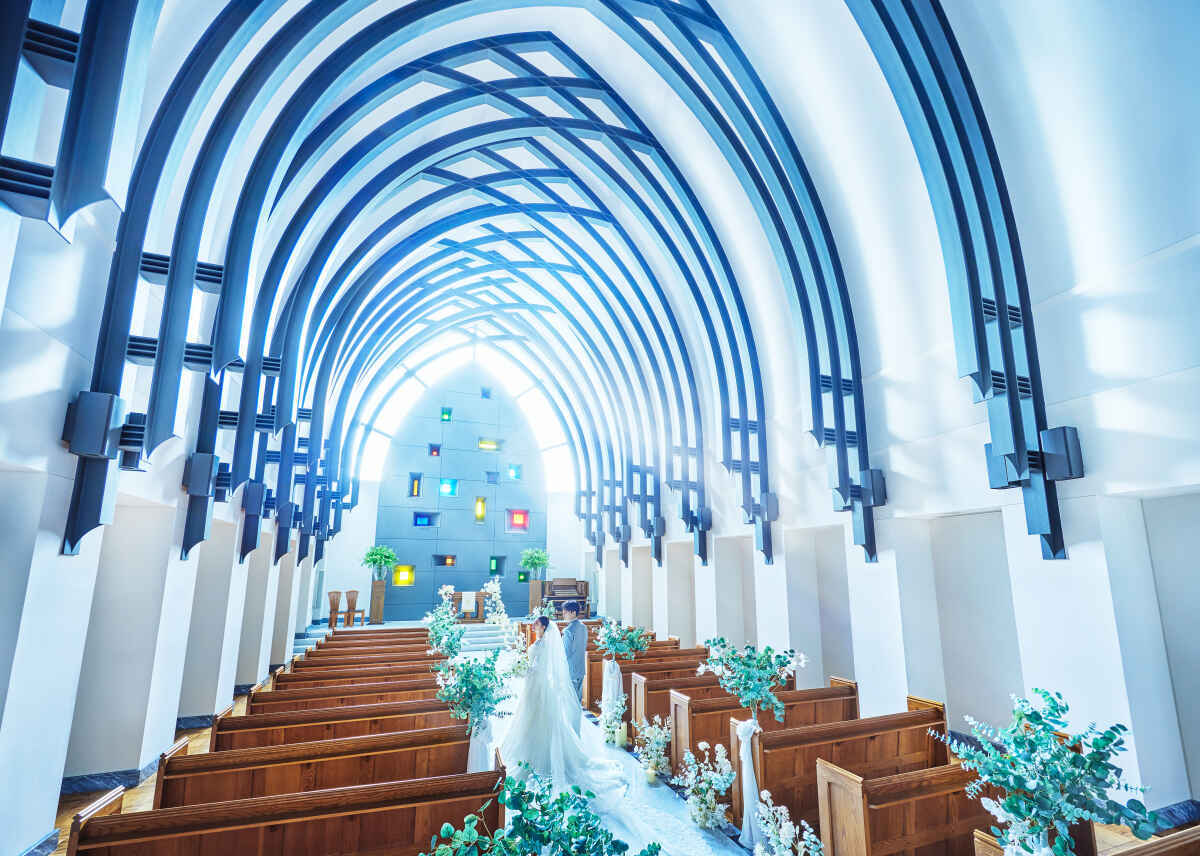 七色のステンドグラスが輝く圧倒的なスケール感、優しい光と開放感のあるチャペル。
